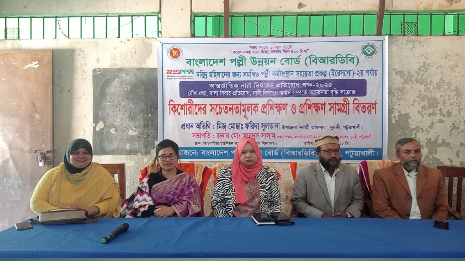 বুধবার (১০ ডিসেম্বর ) সকাল ১১টায়। বাংলাদেশ পল্লী উন্নয়ন বোর্ড (বিআরডিবি)-এর আয়োজনে, দুমকি উপজেলার আংগারিয়া ইউনিয়ন বালিকা মাধ্যমিক বিদ্যালয়ে কিশোরীদের এই সচেতনতামূলক প্রশিক্ষণ দেওয়া হয়।