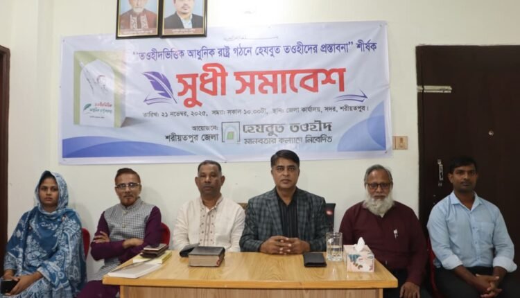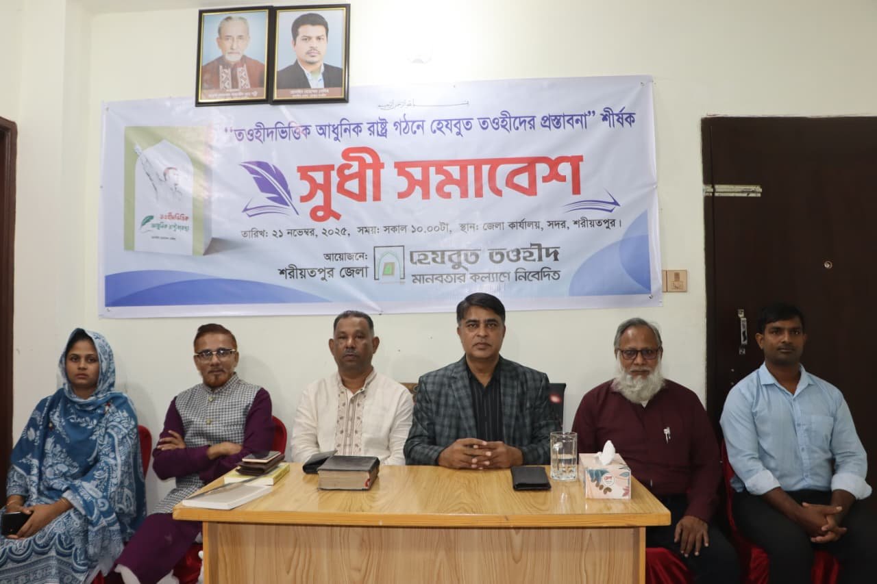 আল্লাহর হুকুমের ভিত্তিতে রাষ্ট্রব্যবস্থা প্রবর্তনের দাবি জানিয়ে সুধী সমাবেশ করেছে হেযবুত তওহীদ। আজ শুক্রবার (২১ নভেম্বর) সকাল ১০টায় হেযবুত তওহীদের শরিয়তপুর জেলা কার্যালয আয়োজিত সুধী সমাবেশে “তওহীদভিত্তিক আধুনিক রাষ্ট্রব্যবস্থা”র প্রস্তাবনা তুলে ধরে সংগঠনটি। সভায় সাংবাদিক, শিক্ষক, আইনজীবী, সুশীল সমাজের প্রতিনিধি নেতৃবৃন্দ উপস্থিত থেকে মুক্ত আলোচনায় অংশগ্রহণ করেন।