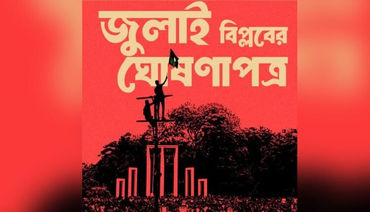 বৈষম্যবিরোধী ছাত্র আন্দোলন ছাত্র-জনতার গণঅভ্যুত্থানকে সমুন্নত রাখতে আগামী ৩১ ডিসেম্বর (মঙ্গলবার) কেন্দ্রীয় শহিদ মিনারে ‘জুলাই বিপ্লবের ঘোষণাপত্র’ প্রকাশ করবে। সেই ঘোষণাপত্রে পরবর্তী বাংলাদেশের স্বপ্ন, আকাঙ্ক্ষা, অভিপ্রায়, লক্ষ্য ও ইশতেহার লিপিবদ্ধ থাকার কথা জান গেছে।
