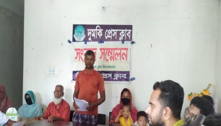 শনিবার সকাল ১১টায় দুমকী প্রেসক্লাবে সংবাদ সম্মেলনে এ অভিযোগ করেন সহোদর আঃ খালেক হাওলাদার। যদিও এ অভিযোগ অস্বীকার করেছেন নুরুল ইসলাম হাওলাদার। খালেক হাওলাদার লিখিত অভিযোগে বলেন, দীর্ঘদিন ধরে জমি নিয়ে বিরোধ চলছিল ভাই নুরুল ইসলামের সাথে। ২০১১ সালে বিরোধ মিমাংশা করতে স্থানীয় গণ্যমান্য ব্যক্তিবর্গ শালিস বৈঠক করে রোয়েদাদনামার মাধ্যমে বিরোধীয় জমি বুঝাইয়া দিলেও কিছুদিন পর শালিস বৈঠকের সিদ্ধান্ত অমান্য করে জবরদখল করে তার ভাই। এরপরই ২০২৪ সালের ২ জানুয়ারি পটুয়াখালী সিনিয়র জজ আদালতে মামলা করেন ভুক্তভোগী ।ওই বছরের ১৩ ফেব্রুয়ারী আদালত উক্ত জমিতে স্থাপনা নির্মাণে অস্থায়ী নিষেধাজ্ঞা জারি করেন। পুনরায় আদালতের নিষেধাজ্ঞা অমান্য করে জমিতে স্থাপনা নির্মাণ করতে গেলে খালেক হাওলাদার বাঁধা দিলে প্রাণনাশের হুমকি দেয় তাঁরা। প্রান রক্ষার জন্য ওই বছরের ১ সেপ্টেম্বর তারিখে পটুয়াখালী ম্যাজিষ্ট্রেট আদালতে ১০৭/১১৪/১১৭( সি) মামলা দায়ের করলে দুমকী থানার এএসআই দুলাল সরকার অভিযোগের সত্যতা পেয়েছে মর্মে ২০২৪ সালের ১ অক্টোবর আদালতে তদন্ত প্রতিবেদন দাখিল করেন। এ বছরের এপ্রিল মাসের গত সপ্তাহে পুনরায় নিষেধাজ্ঞার জমিতে স্থাপনার কাজ শুরু করলে দুমকী থানার ভারপ্রাপ্ত কর্মকর্তার স্মরনাপন্ন হলে তিনি আমাদের উভয়পক্ষকে ডেকে আদালতের নিষেধাজ্ঞা মানতে পরামর্শ দেন। প্রশাসনের নির্দেশ অমান্য করে বিরোধপূর্ণ জমিতে স্থাপনা নির্মাণ করতে শুরু করলে আমরা বাঁধা প্রদান করতে গেলে তাঁরা আমাদেরকে প্রাণে মারার হুমকি দেন।