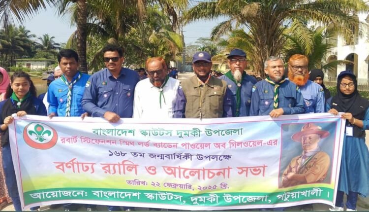 বাংলাদেশ স্কাউটস্ দুমকি উপজেলা কর্তৃক আয়োজিত স্কাউটস্ এর প্রতিষ্ঠাতা “রবার্ট স্টিফেনসন স্মিথ লর্ড ব্যাডেন পাওয়েল অব গিলওয়েল” এর ১৬৮ তম জন্মদিন উপলক্ষে এক বনার্ঢ্য র্যালি ও আলোচনা সভা অনুষ্ঠিত হয়।
