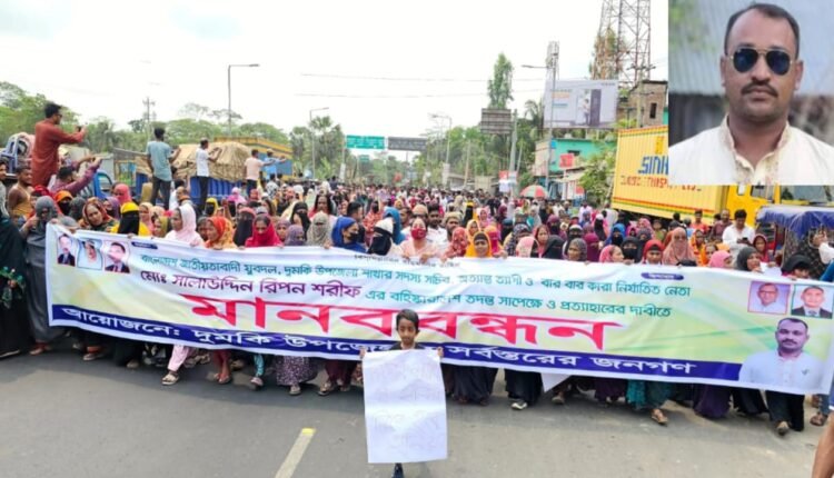 পটুয়াখালীর দুমকি উপজেলা যুবদলের সদস্য সচিব মোঃ সালাউদ্দিন রিপন শরীফের বহিষ্কারাদেশ প্রত্যাহার এবং তদন্ত সাপেক্ষে আদেশ পুর্নবিবেচনার দাবিতে মানববন্ধন ও বিক্ষোভ মিছিল করেছে এলাকাবাসী। বৃহস্পতিবার সকাল সাড়ে দশটায় বরিশাল-পটুয়াখালী মহাসড়কের পায়রা সেতুর টোলপ্লাজার সামনে এ কর্মসূচি পালিত হয়। এতে জাতীয়তাবাদী আদর্শের বিভিন্ন শ্রেণী পেশার প্রায় কয়েক সহস্রাধিক নারী ও পুরুষ অংশগ্রহণ করেন।