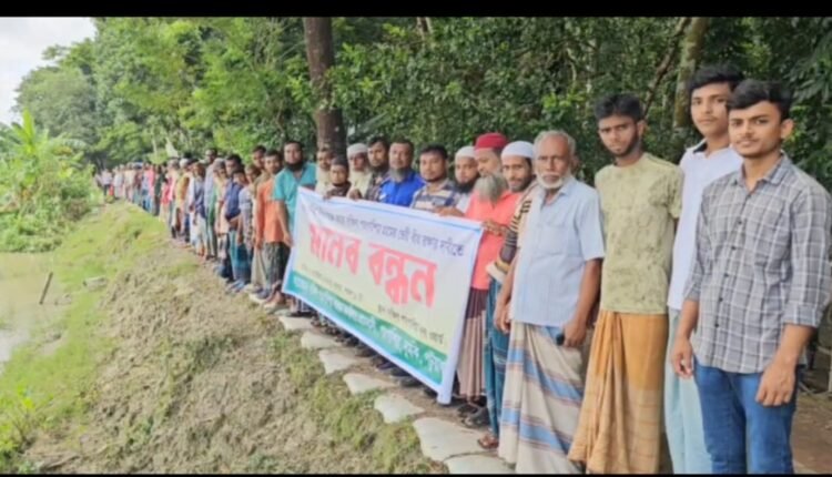 পটুয়াখালীর দুমকিতে কচাবুনিয়া নদীর বেড়িবাঁধ রক্ষার দাবিতে মানববন্ধন করেছেন এলাকাবাসী। বুধবার সকাল সাড়ে ১১ টায় উপজেলার পাঙ্গাশিয়া ইউনিয়নের কচাবুনিয়া নদীর পাড়ে ক্ষতিগ্রস্থ পরিবারের শতাধীক নারী-পুরুষ এ মানববন্ধনে আংশ নেন।
