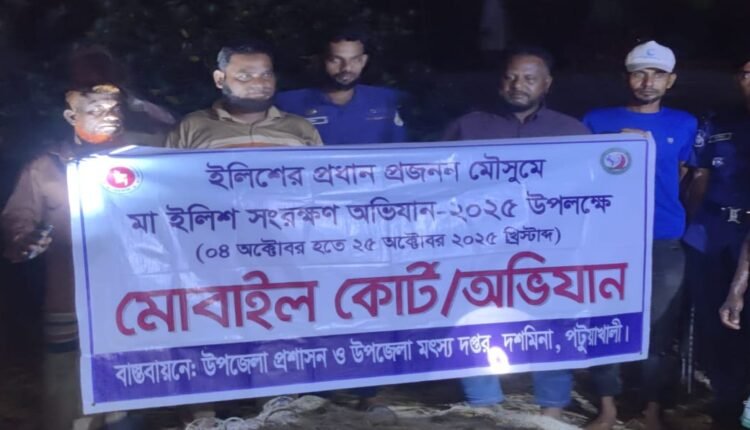 ইলিশের প্রজনন মৌসুমে মা ইলিশ সংরক্ষণে সরকার ঘোষিত ২২ দিনের নিষেধাজ্ঞা অমান্য করে নদীতে মাছ শিকারের অপরাধে পটুয়াখালীর দশমিনা উপজেলায় ব্যাপক অভিযান পরিচালনা করেছে উপজেলা মৎস্য বিভাগ ও নৌ পুলিশ ফাঁড়ি।