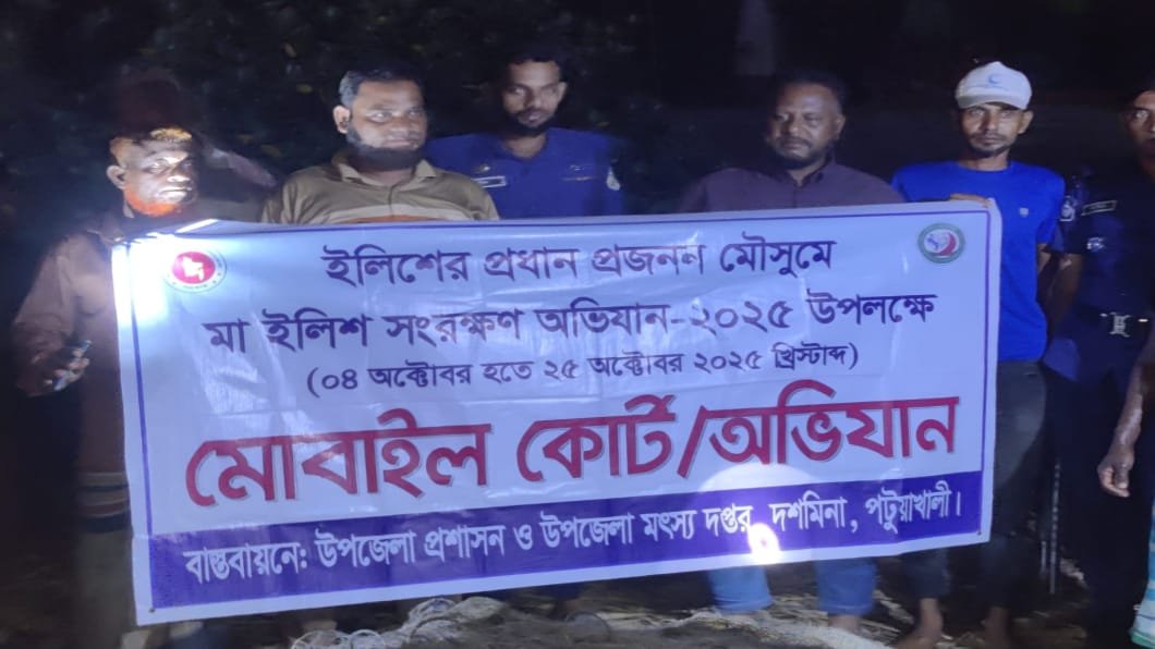 ইলিশের প্রজনন মৌসুমে মা ইলিশ সংরক্ষণে সরকার ঘোষিত ২২ দিনের নিষেধাজ্ঞা অমান্য করে নদীতে মাছ শিকারের অপরাধে পটুয়াখালীর দশমিনা উপজেলায় ব্যাপক অভিযান পরিচালনা করেছে উপজেলা মৎস্য বিভাগ ও নৌ পুলিশ ফাঁড়ি।