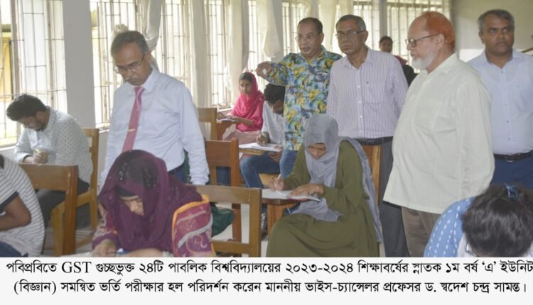 জিএসটি (জেনারেল, সাইন্স এন্ড টেকনোললি) গুচ্ছভুক্ত ‘এ’ ইউনিটের (বিজ্ঞান) পরীক্ষা একযোগে অন্যান্য বিশ্ববিদ্যালয়ের সাথে পটুয়াখালী বিজ্ঞান ও প্রযুক্তি বিশ্ববিদ্যালয়ের মূল ক্যাম্পাসে সুষ্ঠু ও শান্তিপূর্ণ পরিবেশে অনুষ্ঠিত হয়। পবিপ্রবি কেন্দ্রে ‘এ’ ইউনিটের (বিজ্ঞান) পরীক্ষায় প্রায় ৮৫০ জন পরীক্ষার্থী ভর্তি পরীক্ষায় অংশগ্রহণ করেছে। এদিকে দুপুর ১২টায় শুরু হওয়া পরীক্ষায় বিশ্ববিদ্যালয়ের ভাইস-চ্যান্সেলর প্রফেসর ড. স্বদেশ চন্দ্র সামন্ত বিভিন্ন পরীক্ষার হলসমূহ পরিদর্শন করেন। এসময় উপস্থিত ছিলেন, ট্রেজারার প্রফেসর মোহাম্মদ আলী।