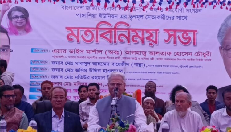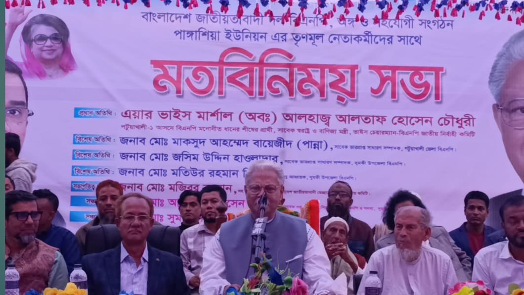 পটুয়াখালী-১ আসনে বিএনপি মনোনীত ধানের শীষের এই প্রার্থী এয়ার ভাইস মার্শাল (অবঃ) আলহাজ্ব আলতাফ হোসেন চৌধুরী প্রধান অতিথির বক্তব্যে বর্তমান প্রেক্ষাপট ও নির্বাচন নিয়ে গুরুত্বপূর্ণ মন্তব্য করেন। তিনি বলেন, বর্তমান সরকার একটি সুষ্ঠু, সুন্দর ও গ্রহণযোগ্য নির্বাচন আয়োজন করে জনপ্রতিনিধিদের কাছে ক্ষমতা হস্তান্তর করতে চায়। যেহেতু ওনারা আমাদের কোনো রাজনৈতিক প্রতিপক্ষ নন, তাই ওনাদের সাথে মিলেমিশে সহযোগিতা করাই আমাদের জন্য মঙ্গলজনক হবে। পাশাপাশি তিনি দলের সকল পর্যায়ের নেতাকর্মীদের ভেদাভেদ ভুলে ঐক্যবদ্ধ থাকার আহ্বান জানান। পাঙ্গাশিয়া ইউনিয়ন বিএনপির সাবেক সভাপতি ও দুমকী উপজেলা বিএনপির সদস্য জনাব মোঃ আনোয়ার হোসেন ফরাজী এবং দুমকী উপজেলা ছাত্রদলের সদস্য সচিব জনাব মোঃ সুমন শরীফ এর যৌথ সঞ্চালনায়,