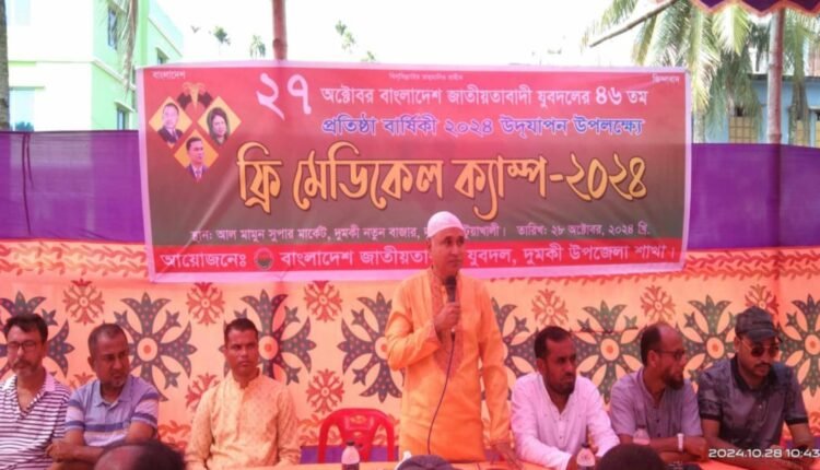 বাংলাদেশ জাতীয়তাবাদী যুবদলের ৪৬তম প্রতিষ্ঠা বার্ষিকী উদযাপন উপলক্ষে পটুয়াখালীর দুমকি উপজেলা জাতীয়তাবাদী যুবদলের উদ্যোগে ফ্রি মেডিকেল ক্যাম্প ও ঔষধ বিতরন কর্মসূচী পালিত হয়েছ সোমবার(২৮অক্টোবর) সকাল ৯টায় উপজেলার নতুন বাজাররস্হ আল মামুন সুপার মার্কেট চত্বরে উক্ত মেডিকেল ক্যাম্প ও ঔষধ বিতরন কর্মসূচীর উদ্বোধন করেন উপজেলা বিএনপি’র সভাপতি মোঃ খলিলুর রহমান।