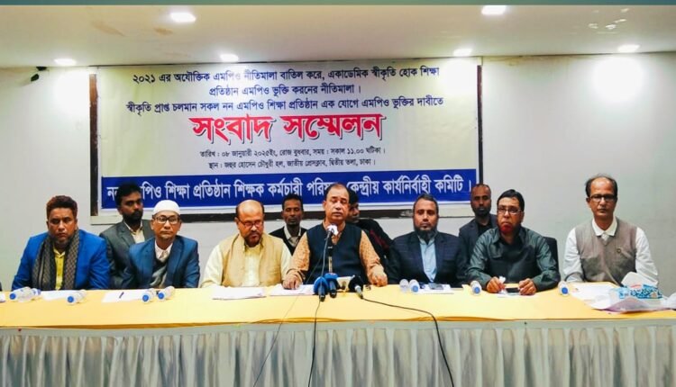বিগত ফ্যাসিস্ট সরকারের এমপিও  নীতিমালা ২০২১ বাতিল করে স্বীকৃতিপ্রাপ্ত সকল শিক্ষা নন – এমপিও শিক্ষা  প্রতিষ্ঠান একযোগে এমপিওভুক্তির দাবিতে  ৮ই জানুয়ারি জাতীয় প্রেসক্লাবের জহুর হোসেন চৌধুরী হলে  সাংবাদ সম্মেলন করেন নন- এমপিও শিক্ষা প্রতিষ্ঠান শিক্ষক-কর্মচারী পরিষদ।