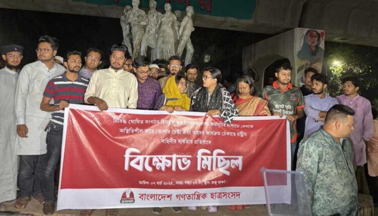 রাজধানীতে নিষিদ্ধ ঘোষিত সংগঠন হিযবুত তাহরীরের মিছিলের প্রতিবাদে ঢাকা বিশ্ববিদ্যালয়ে বিক্ষোভ-সমাবেশ করেছে বাংলাদেশ গণতান্ত্রিক ছাত্র সংসদ।